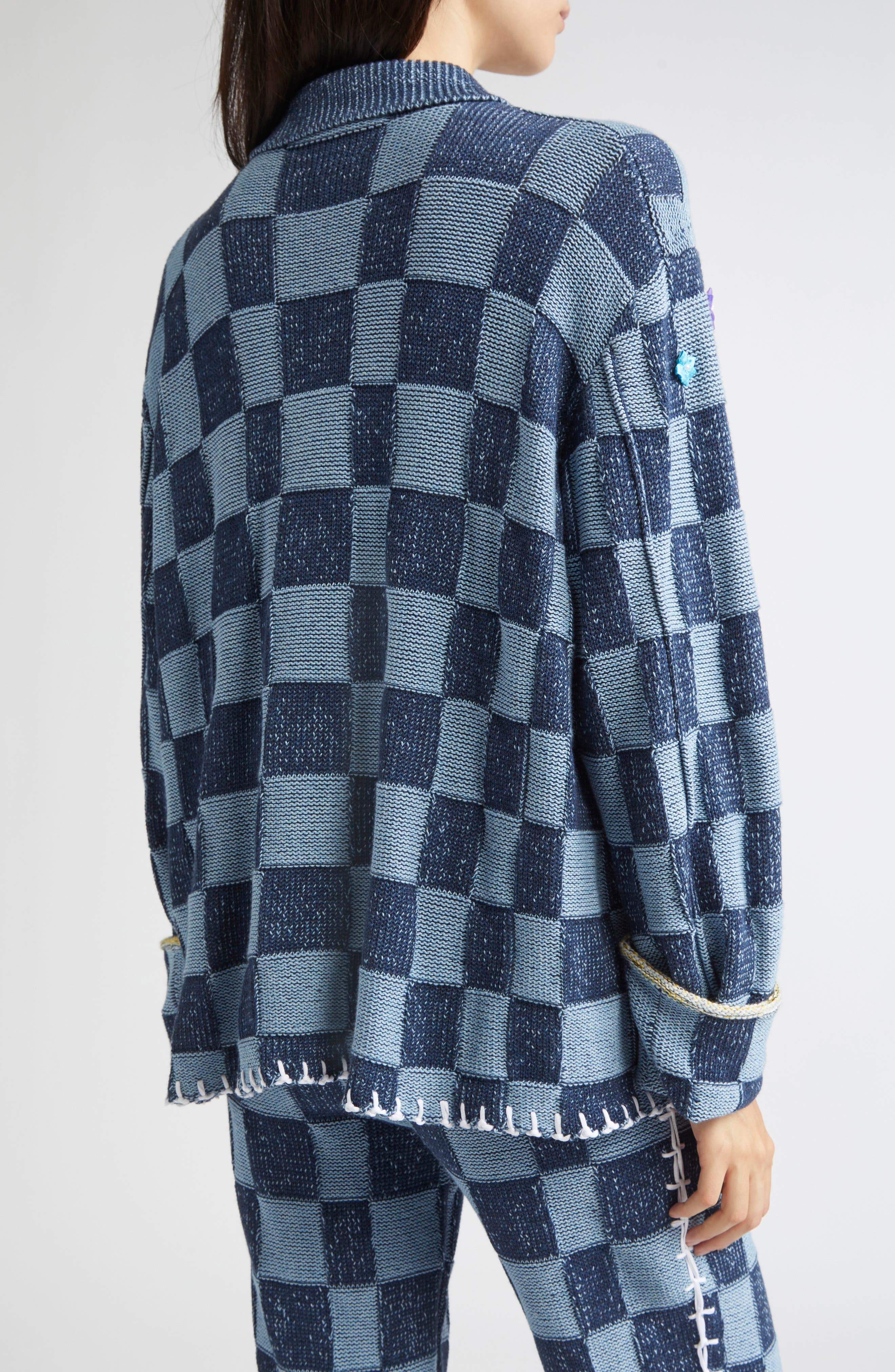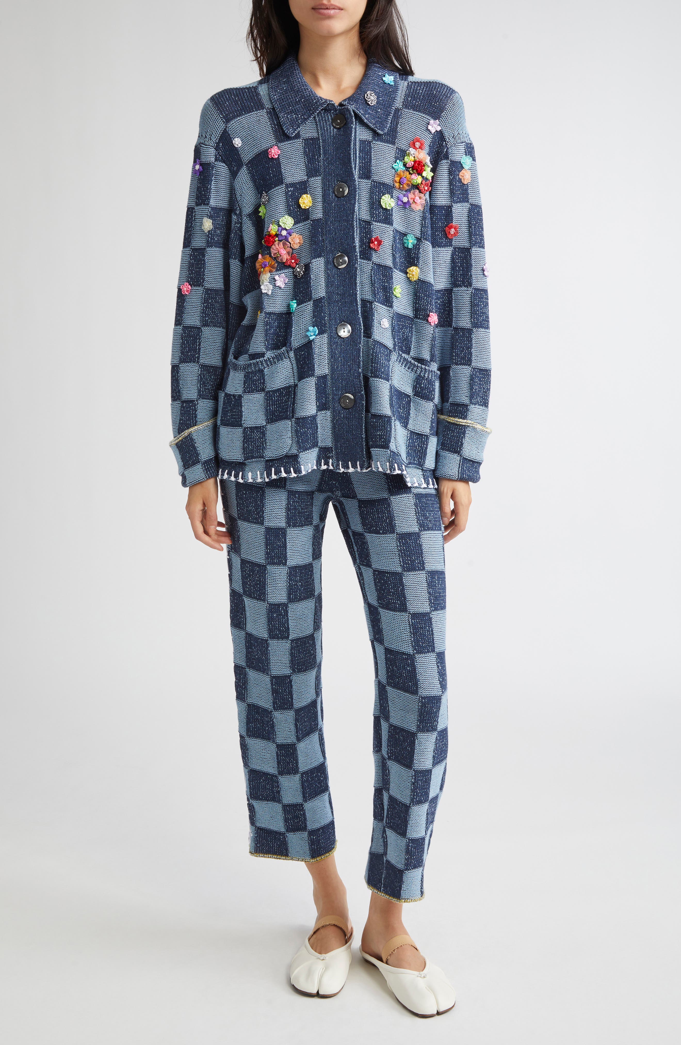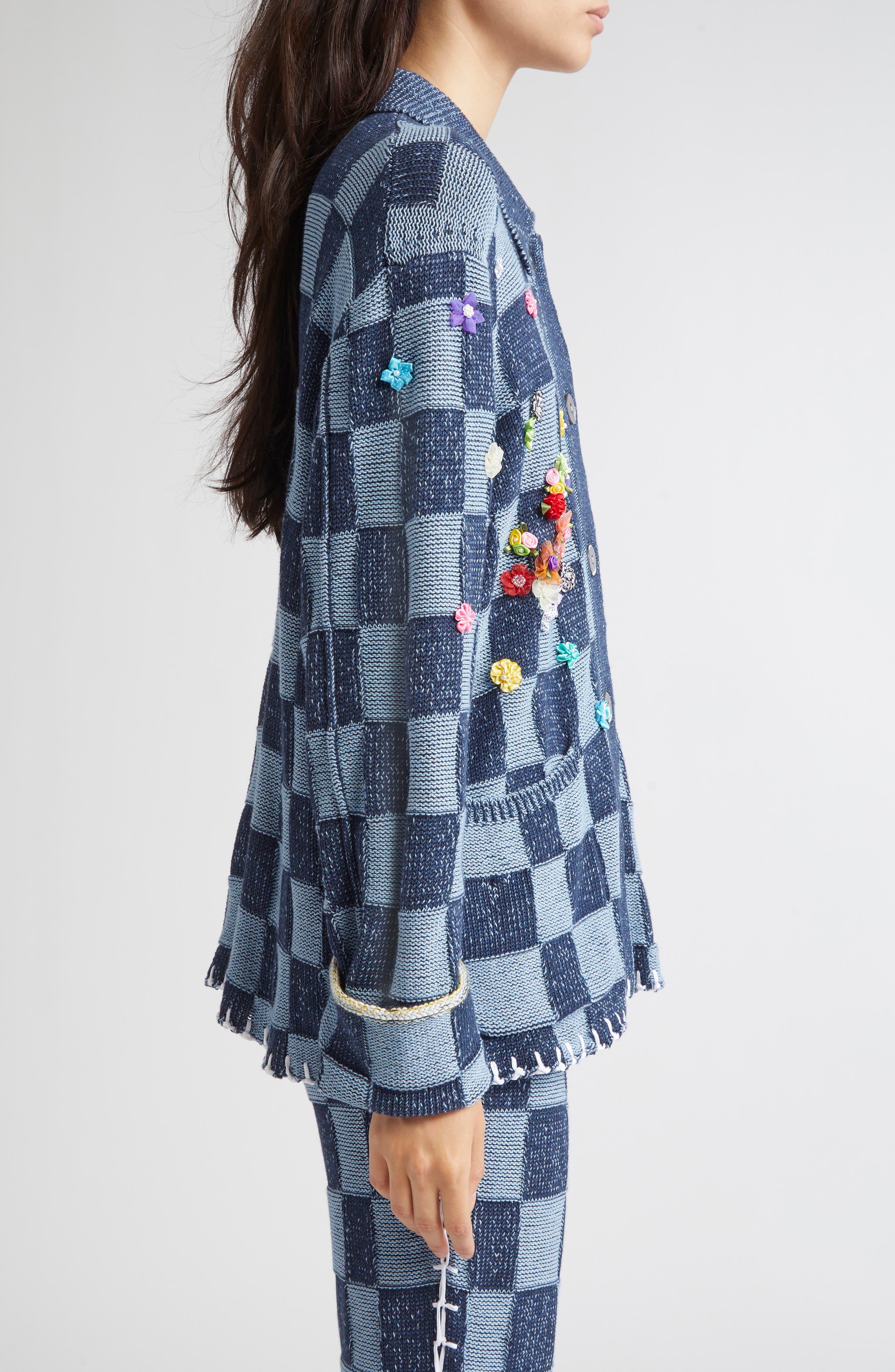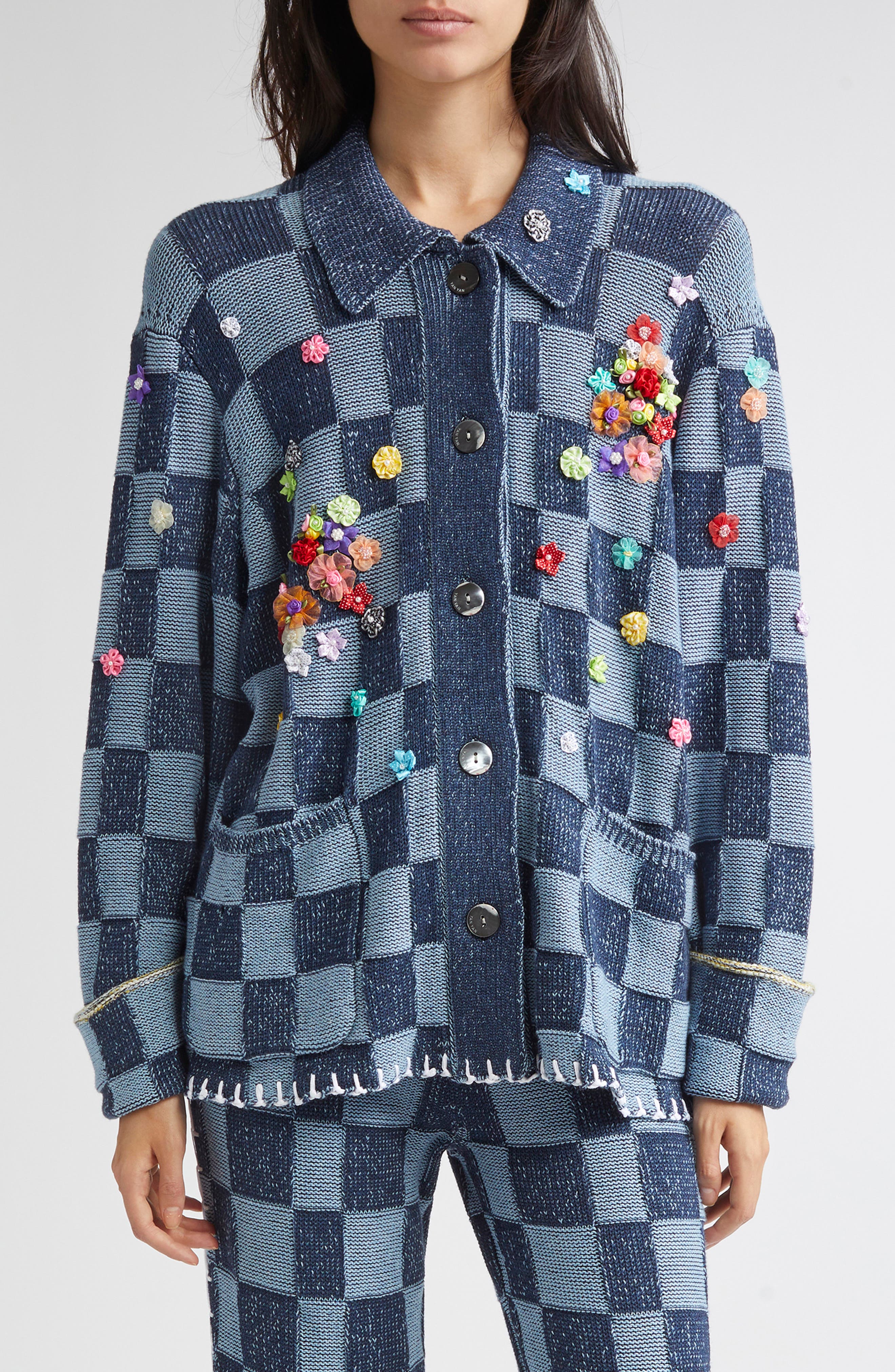YanYan Floral Ribbon Checkerboard Knit Work Jacket_Denim